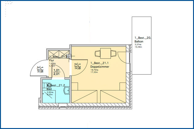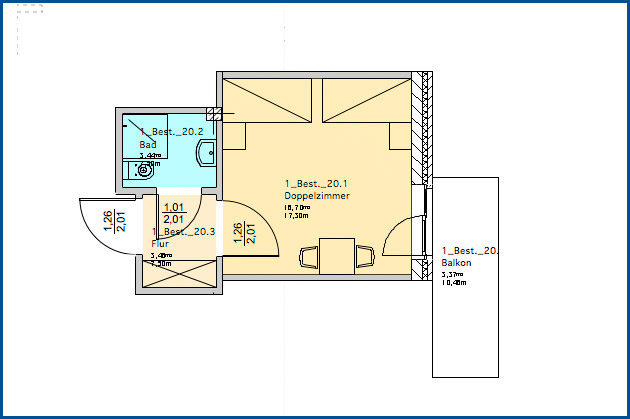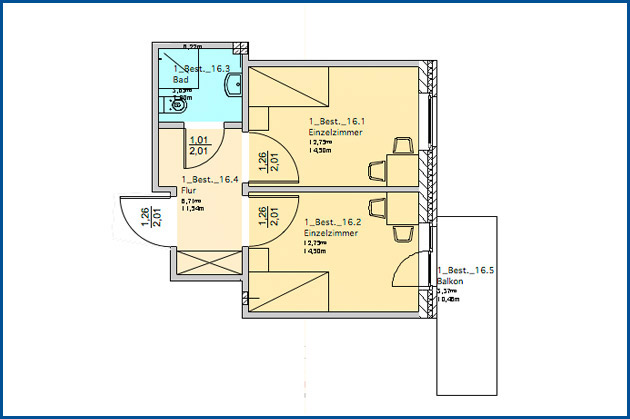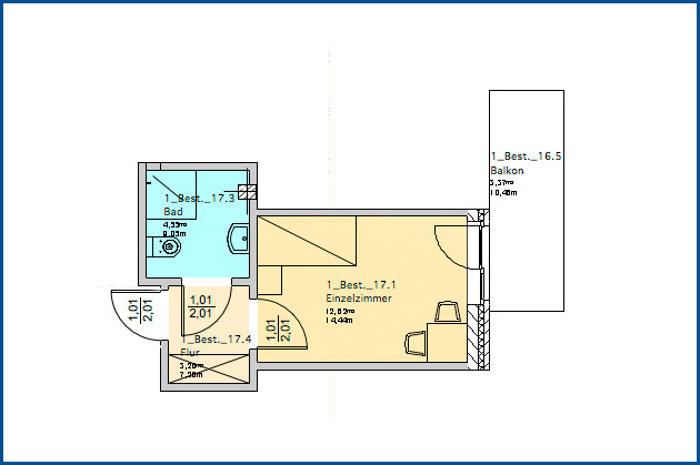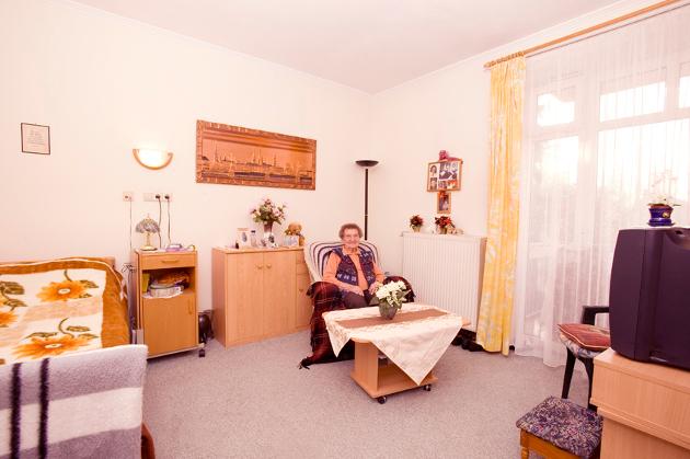 Zu jedem Zimmer gehören ein Vorflur mit Einbauschränken, sowie eine eigene Sanitäreinheit. Mitgebrachte Kleinmöbel, Bilder und andere Einrichtungsgegenstände finden immer einen Platz. Jeder Bewohner kann einen eigenen Telefon- und Fernsehanschluss nutzen.